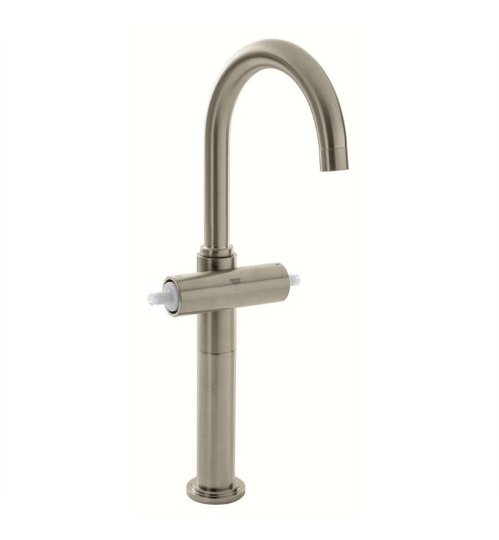 The Grohe Atrio Deck Mount Vessel in Brushed Nickel delivers an accommodating design that provides ample sink clearance with its high-arc swivel spout. The Chrome finish lends added durability to the design for long-lasting quality. A dual handle setup offers smooth operation to provide more precise temperature control.